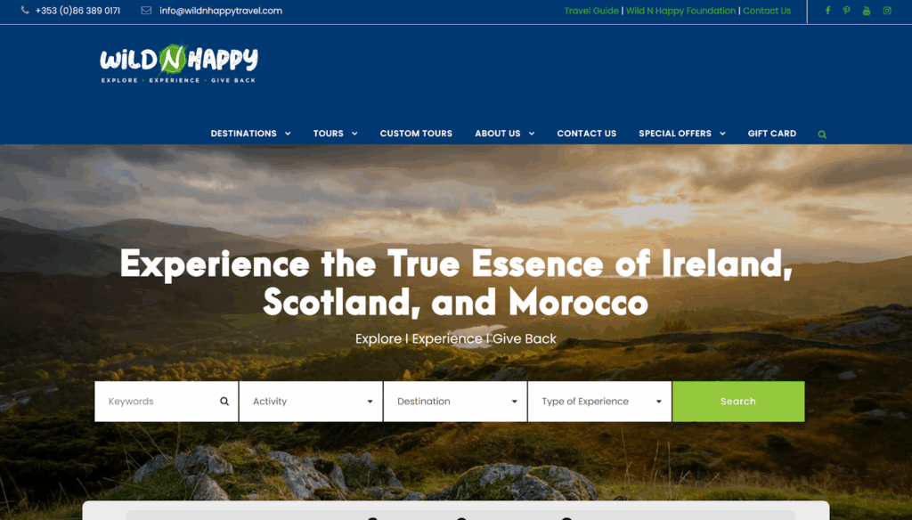 Wild N‘ Happy konzentriert sich auf Abenteuer- und Erlebnisreisen in Irland und ist eine Option für Reisende, die mehr als nur Sightseeing suchen. Ihre Touren sind oft aktiv gestaltet und beinhalten Aktivitäten wie Wandern, Surfen oder Kajakfahren. Das Unternehmen legt Wert auf kleine Gruppengrößen, um ein intensiveres und persönlicheres Erlebnis zu gewährleisten. Die Routen führen oft abseits der ausgetretenen Pfade zu spektakulären Naturlandschaften.