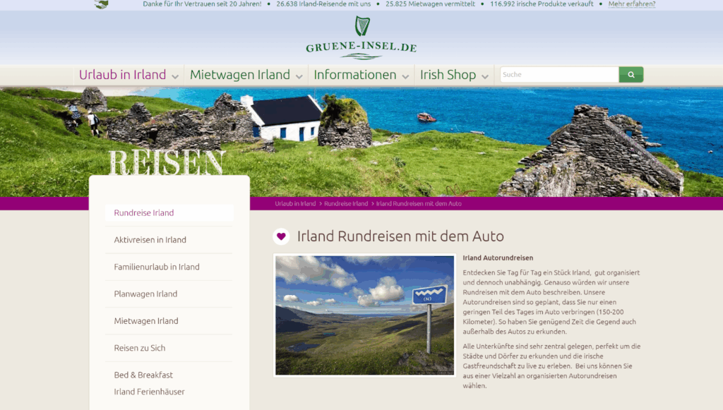 Grüne Insel Reisen hat sich als einer der führenden Spezialisten für Irland Reisen etabliert. Sie bieten eine beeindruckende Vielfalt an Rundreisen, die auf unterschiedliche Vorlieben zugeschnitten sind. Besonders hervorzuheben sind ihre Selbstfahrer-Touren, die dir maximale Flexibilität bei der Erkundung der Insel ermöglichen. Bei einer Irland Rundreise mit dem eigenen Auto kannst du dein eigenes Tempo bestimmen und spontan entscheiden, wo du länger verweilen möchtest. Das Angebot reicht von klassischen Routen entlang der Küste bis hin zu thematischen Reisen, die sich auf bestimmte Regionen oder Interessen konzentrieren.