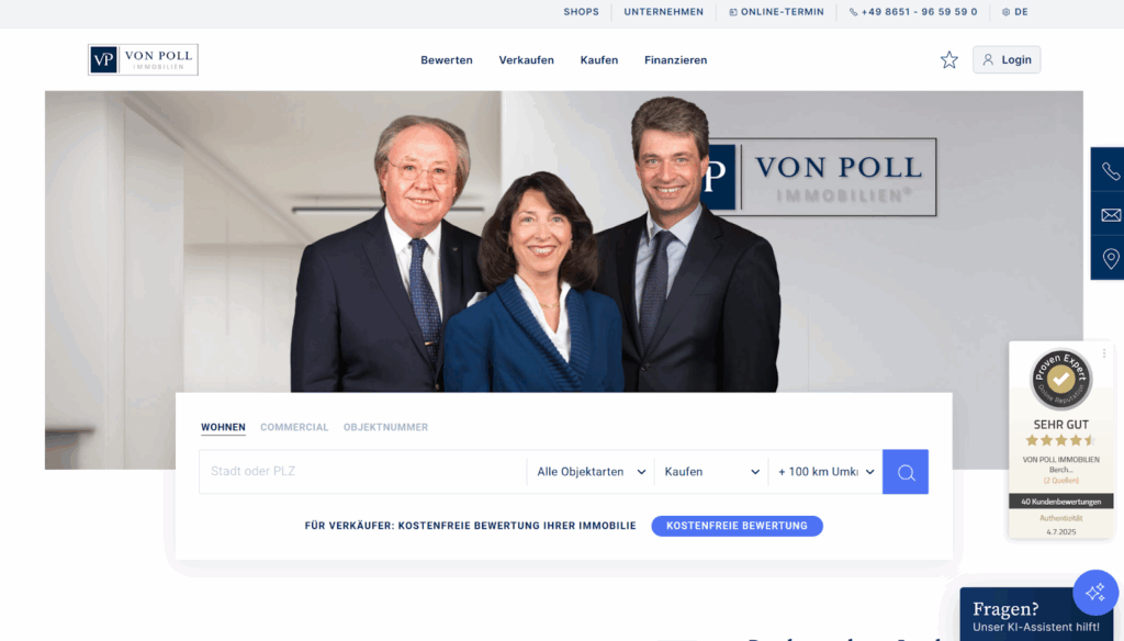 VON POLL IMMOBILIEN ist eine national etablierte Marke, die in Traunstein durch ein lokales Büro vertreten ist. Die Stärke dieses Anbieters liegt in der Verbindung eines starken nationalen und internationalen Netzwerks mit der notwendigen lokalen Marktkenntnis. Dieses Zusammenspiel ist besonders vorteilhaft für Verkäufer von Premium-Immobilien oder jene, die eine breitere Käuferschicht außerhalb der Region ansprechen möchten. Der hohe Qualitätsstandard in der Präsentation und die professionelle Abwicklung sind hier besonders hervorzuheben.